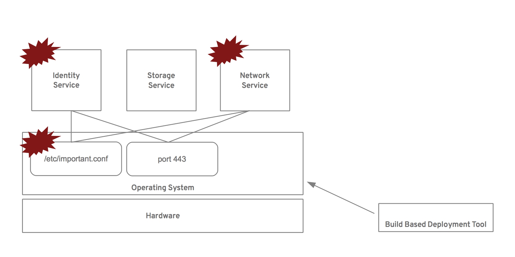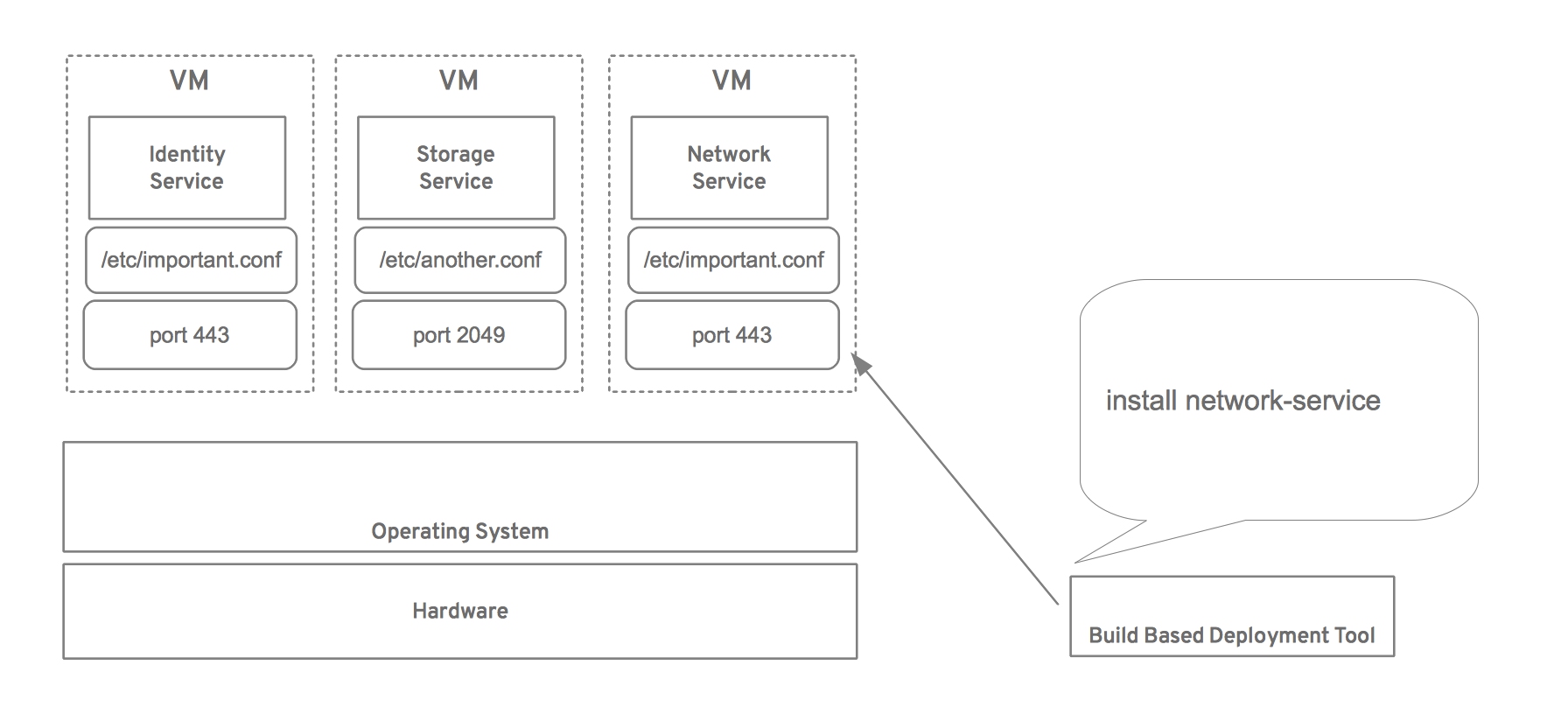 It is possible to combine multiple services on a single operating system, but this can get tricky. How does the lifecycle management tool know that OpenStack Service A in the image above won’t conflict with OpenStack Service B in terms of resources required, ports required, file systems, etc? It takes an awful lot of logic in a lifecycle management tool to know this and given the rate of change experienced in a community like OpenStack, lifecycle management tools have a hard time keeping up and delivering what users would like to deploy. Could virtual machines be used here? Possibly, but virtual machine are heavyweight and also lack rich metadata or require large infrastructures and agents loaded into those virtual machines to get metadata. In other words, VMs are too heavy and they also lack the concept of inheritance.